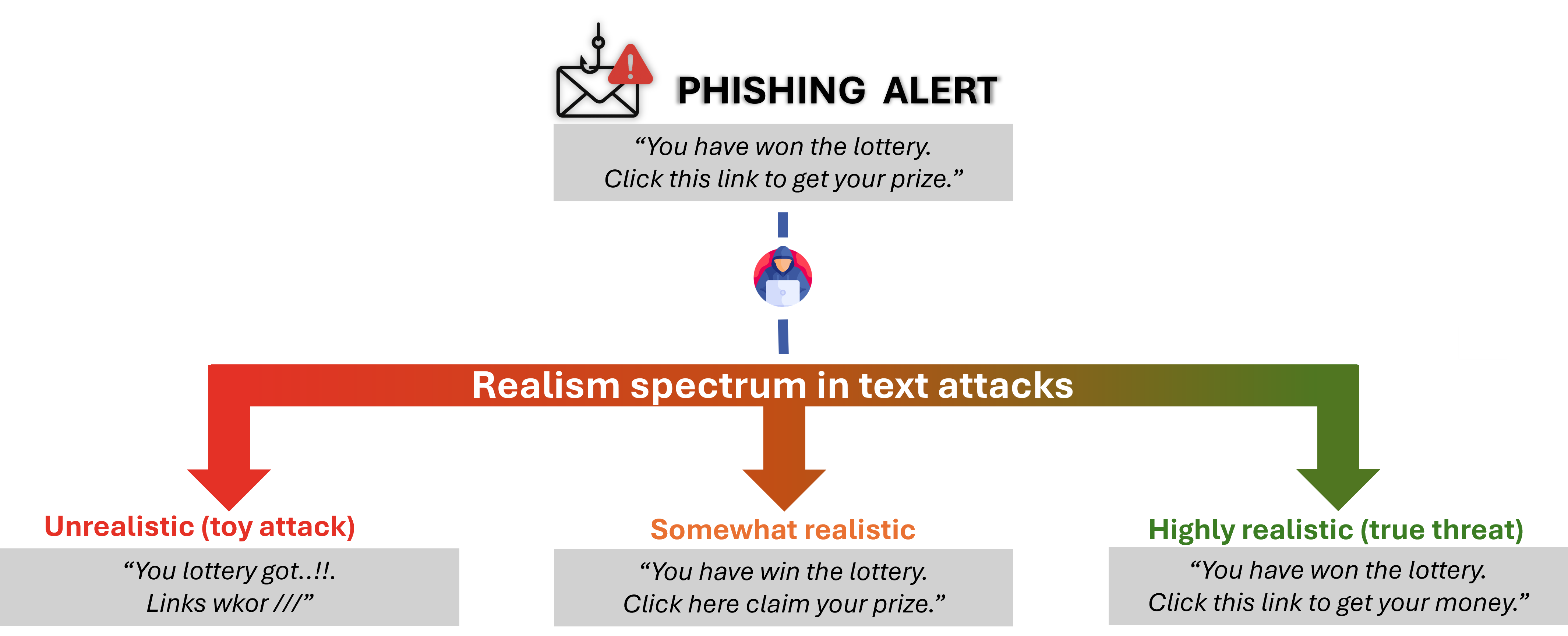 To understand realism for text attacks, it helps to see it as a spectrum. At one end are unrealistic attacks that are easy for humans to detect, but may still confuse automated models. In the middle are somewhat realistic attacks that sound plausible but still raise suspicion. At the far end are highly realistic attacks designed to deceive both humans and AI/ML systems.