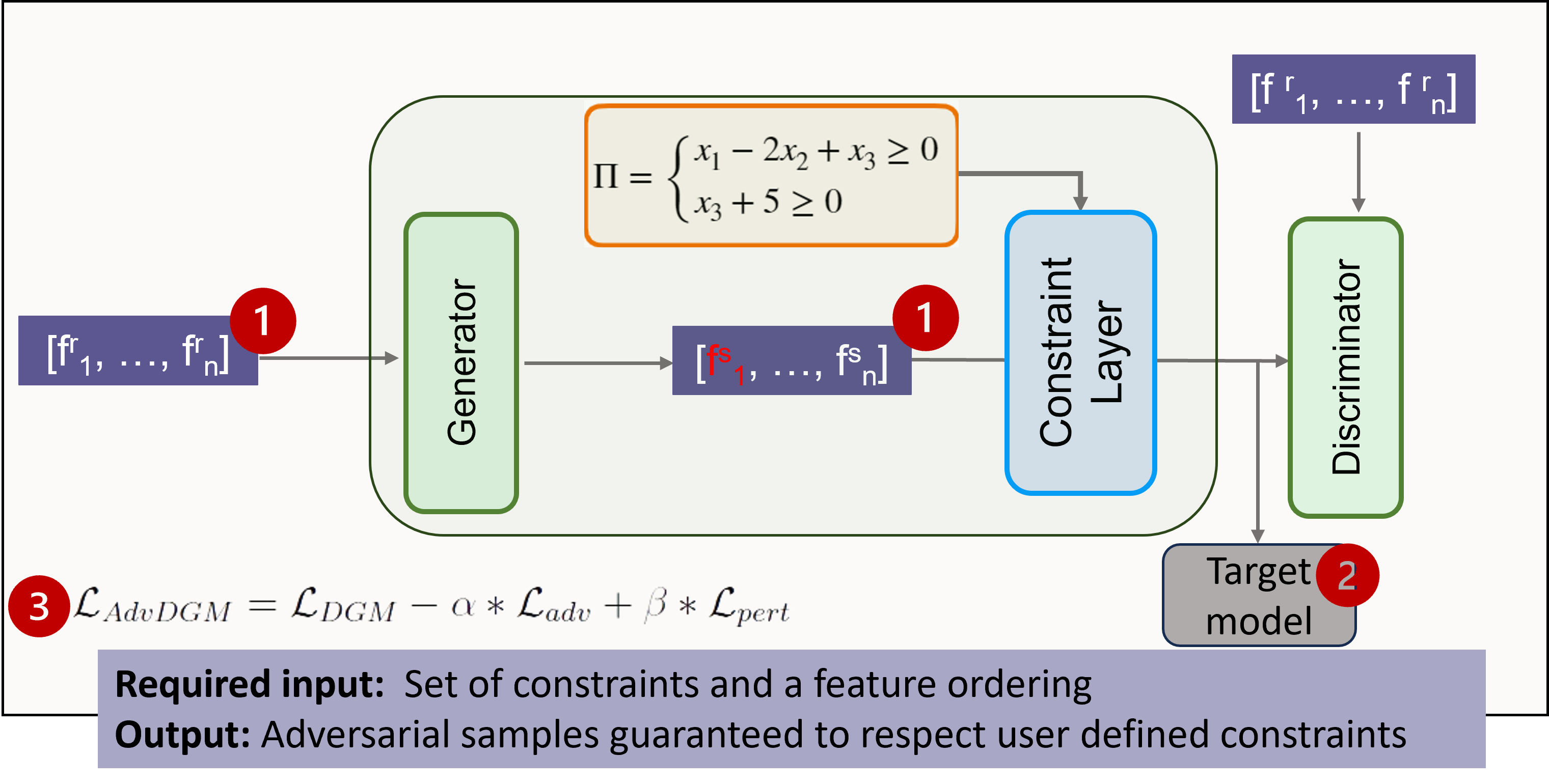In this post, we explore exactly that. By extending C-DGMs to generate adversarial examples, we arrive at Constrained Adversarial DGMs (C-AdvDGMs). By enforcing domain constraints, these examples remain valid and realistic, reflecting the types of inputs a model might encounter in practice and making the attacks practically relevant. This approach is described in our work Deep Generative Models as an Adversarial Attack Strategy for Tabular Machine Learning, which presents the methods behind C-AdvDGMs.
